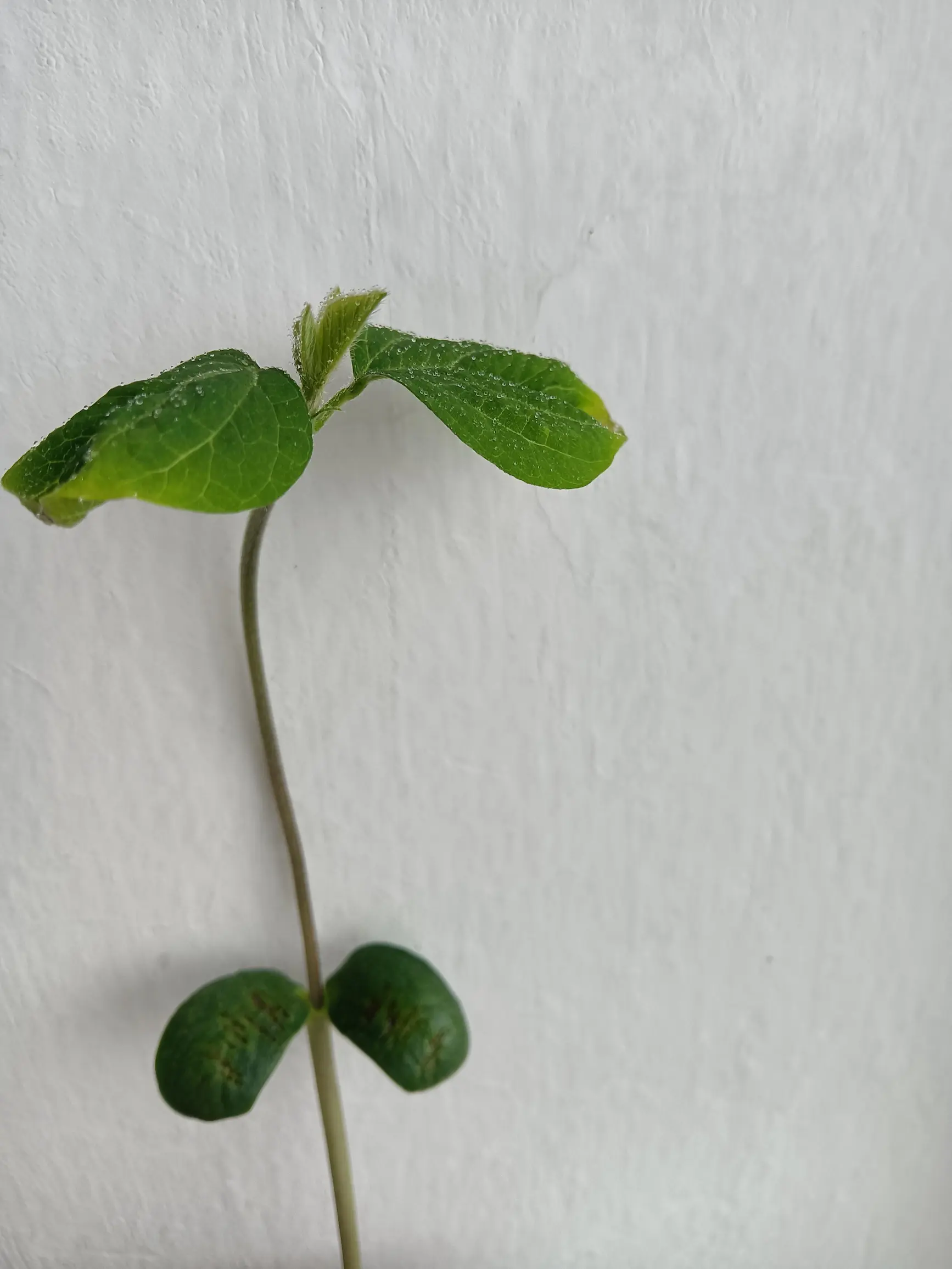 总共长出了三组叶片。让我觉得疑惑的是,最先长出来的第一组叶片,只有两片叶片,但是后面生长的叶片,每组都有三片叶片;并且第一组叶片的形态与其他的叶片形态并不相同,第一组叶片比较园,且叶片较厚,而其他几组的叶片比较尖,且叶片较薄。