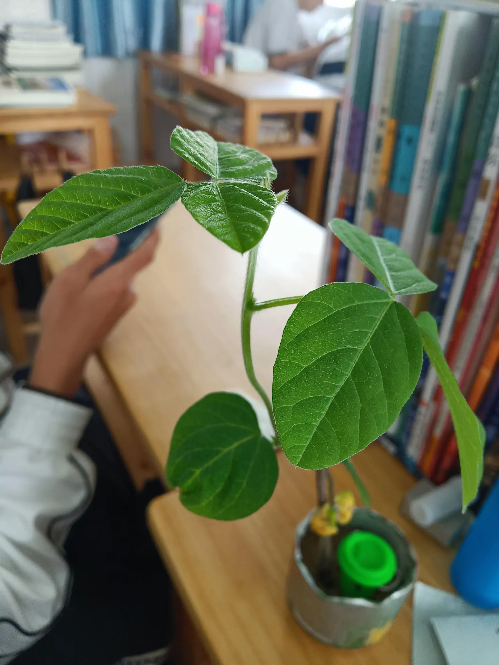 再过几天就要考试了,好多教室要作为考场,我所在的教室也是。于是我便将这棵黄豆搬到讲台上,靠在教室里原本那盆盆景上面。后来 Honzer 偶尔有来浇水,他还看见过有在那个考场的同学也有去浇水。