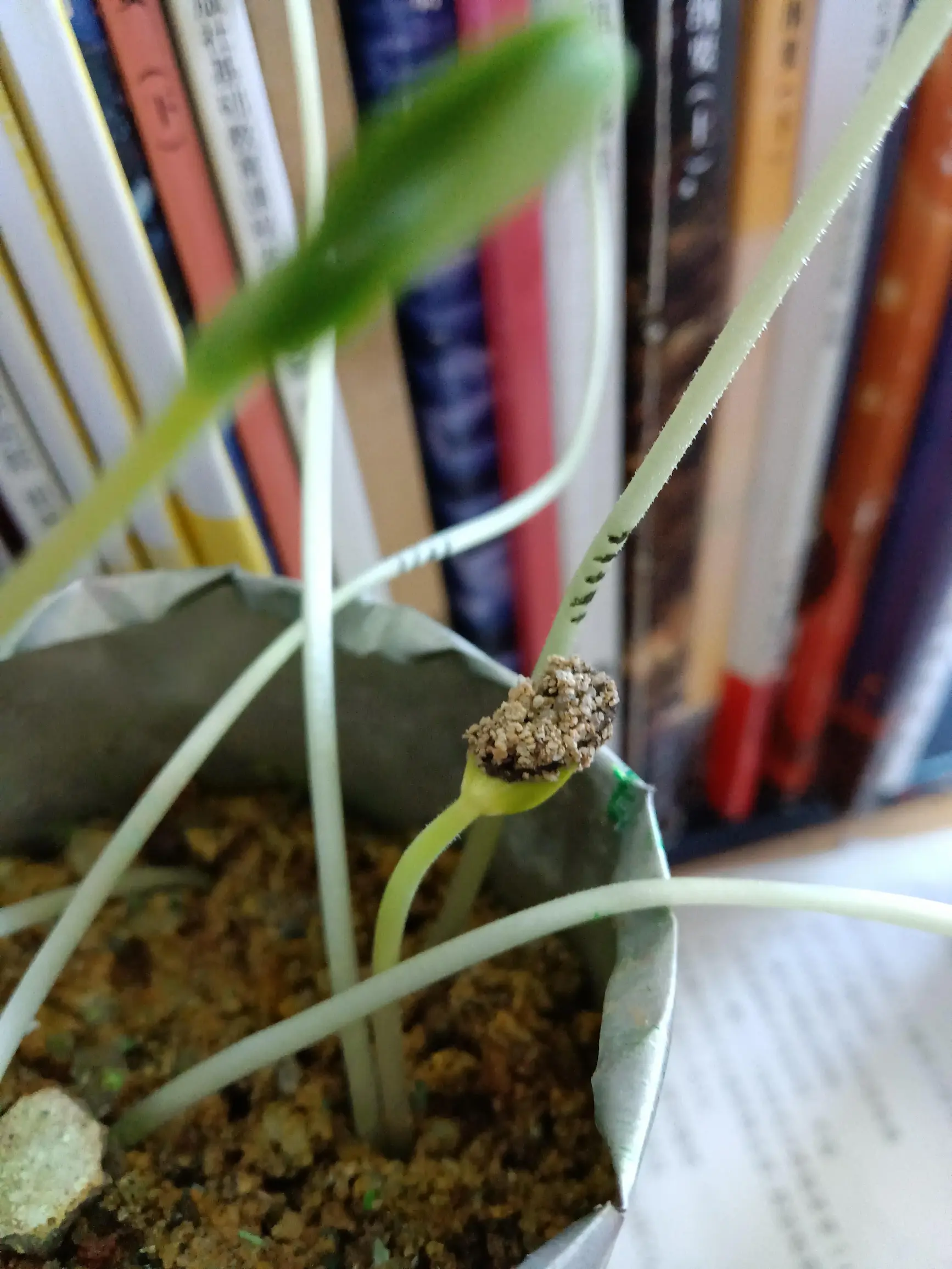 然而,今天下午,出了“大事故”。在放书的时候我实在是太不小心了,一下子压断了好几株,现在是剩下 2 株还健在,第 7 株发育良好,最让我期待的一株被我压死了。( ≧Д≦)