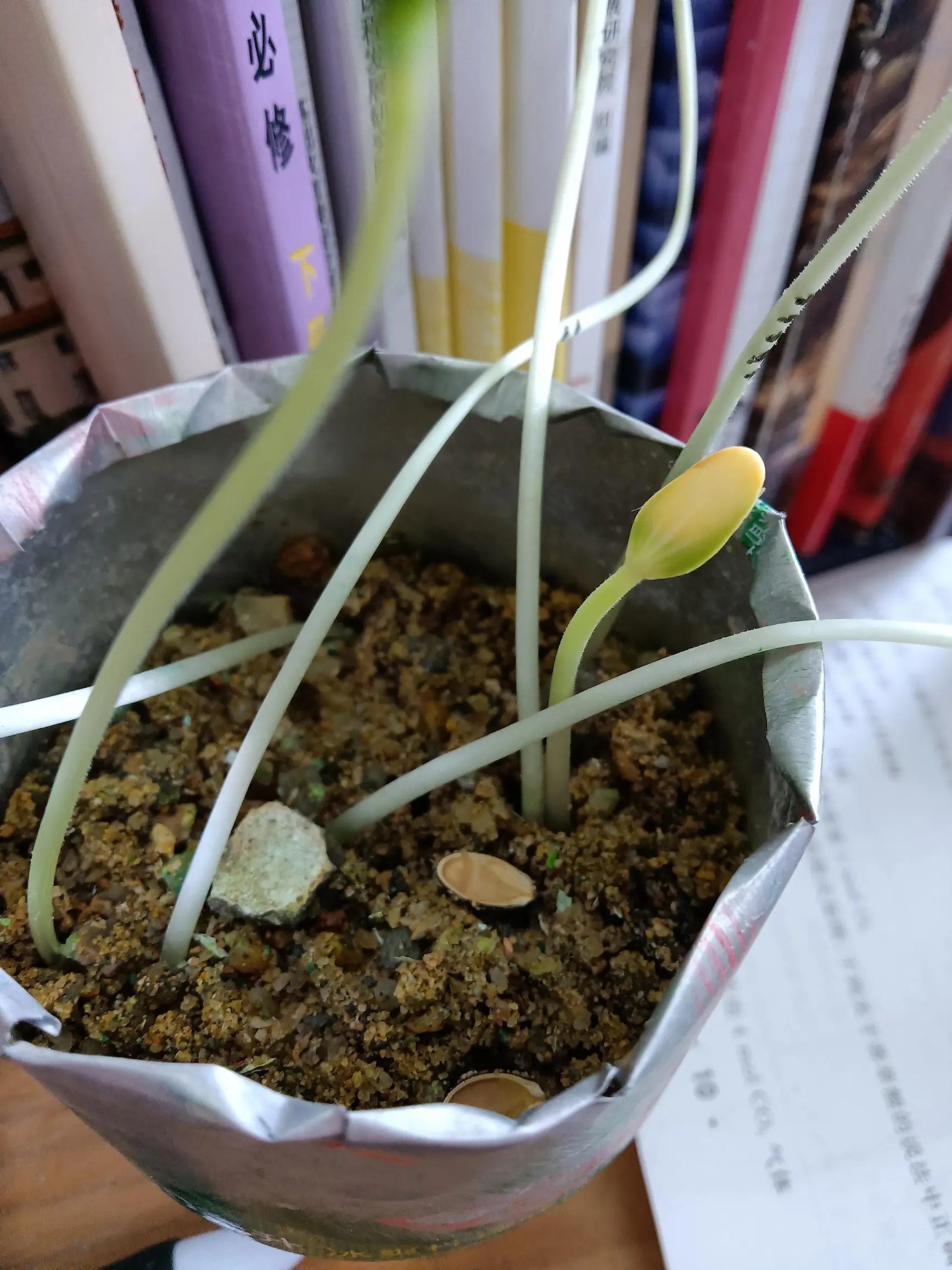 先长出来了三棵,其中两棵子叶上有一堆土,我看了半天,用螺丝刀弄了半天也没把土弄掉,这什么土啊,粘性这么强…结果呢,是子叶外面还套着一层种壳。我不懂,但感觉这种壳可能会影响植株的发育,而且上面的土弄到桌子上到处都是就不好了(自从带了土,桌上就一直有土的颗粒),就把棵去掉了,看起来没伤到子叶。两个被种壳包住的子叶还是嫩黄色的。