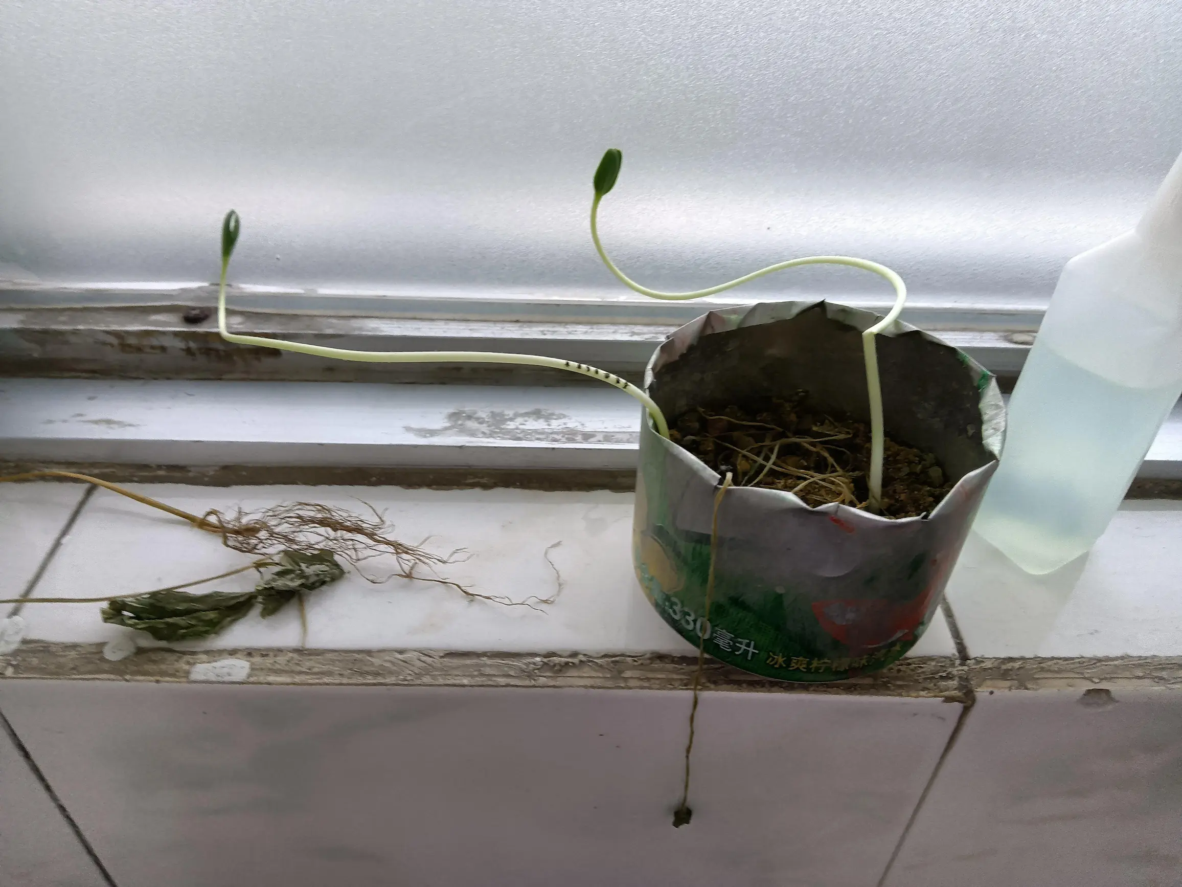 今天一来,发现第三株倒在旁边的纸盒里,并发现其茎底部变扁了,整株都是软的。目前为止,第七株和第五株长的还不错,不过第六株虽然看着还不错,可是长的还没第七株高。